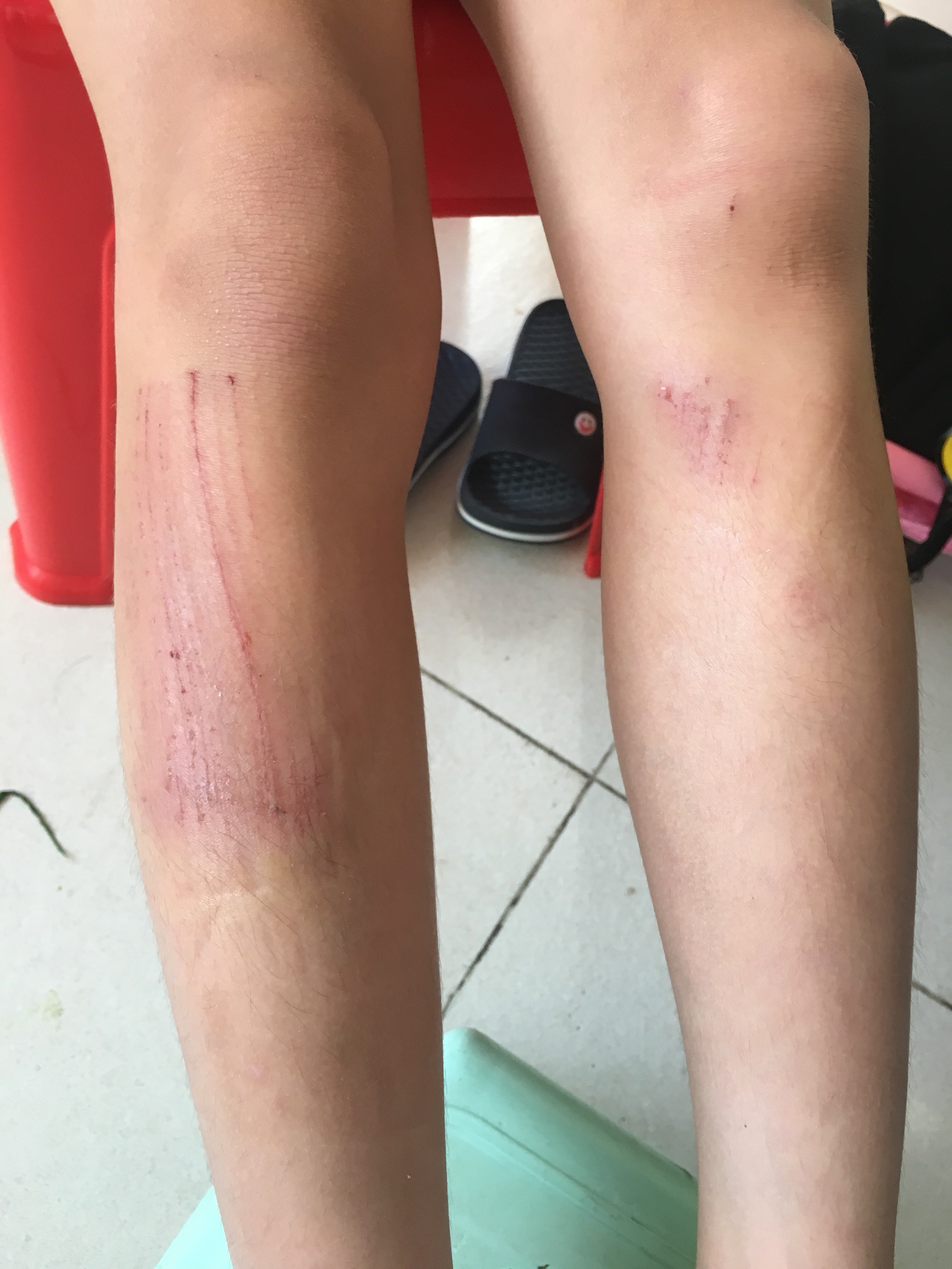 Q放學步下梯級往校巴時,從石級上踏空滾下,同學們都被他嚇壞了,很多師兄都立時向他慰問,萬分感恩只是雙腿擦損流血,沒有撞到頭或扭傷。他很驚很痛呢!只差十幾步便上到校巴了。